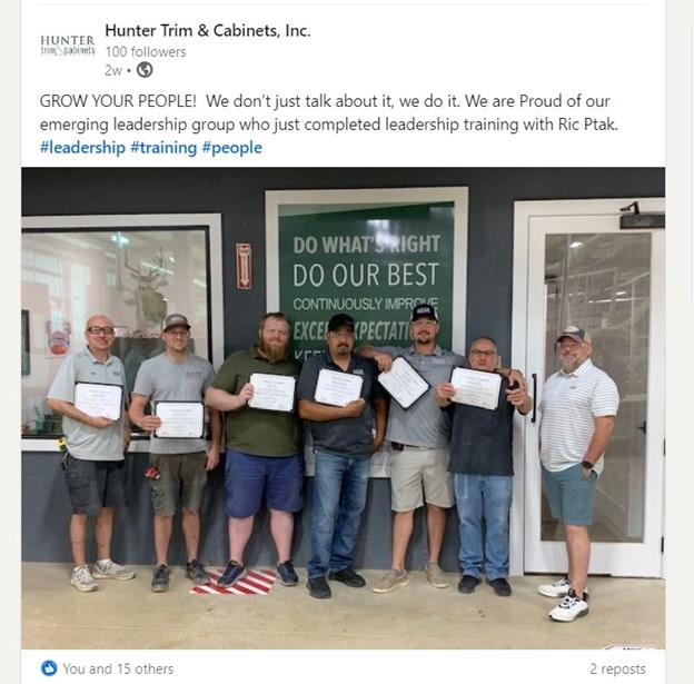 I just finished coaching seven folks at Hunter Trim & Cabinets, Inc. on leadership and communication skills! The focus was on improving communication, so lean implementation tools become more effective and efficient. Thanks to Dustin and Dennis for giving your team the opportunity to raise the bar and move the needle at your company!