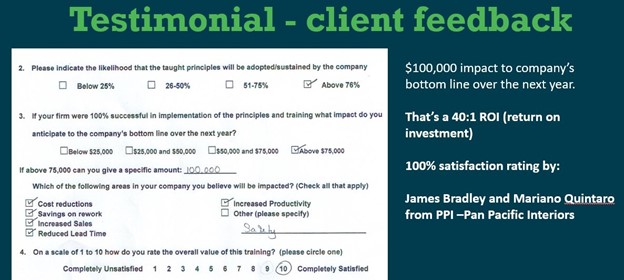 We will train our folks when we have more time, right now we are too busy. This is a common statement that we hear all too often. Usually what happens is that when you have more time, then you don’t (or won’t) make the investment to train. (That’s right, I said investment not expense). Have a look at a recent coaching session and the feedback received from the owner. The return on investment in this case study was 40:1! That means the value they received was 40 times the cost of the coaching sessions. Thanks James Bradley.